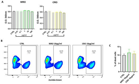 The J774A.1 murine macrophages were used to investigate the anti-inflammatory and antioxidant effects of extracts. First, the cytotoxic effect of both WRO and CRO extracts was evaluated. The J774A.1 macrophages were treated with increasing concentrations of WRO and CRO (from 0.01 to 100 µg/mL) for 24 h, and cell viability was assessed via the MTT assay. As shown in Figure 2, both extracts did not affect the viability of the J774A1 macrophages at all tested concentrations. Therefore, the concentration of 10 µg/mL was selected for characterizing the anti-inflammatory and antioxidant effects. In addition, a flow cytometry analysis, with the Zombie green probe in order to differentiate live vs. dead cells status, was performed. As shown in Figure 2B,C, both extracts did not increase the percentage of dead cells, confirming the non-cytotoxic effect of both WRO and CRO at 10 µg/mL.