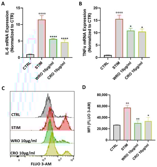 (A,B) J774A.1 cells were treated with extracts (10 μg/mL) for 1 h before stimulation with LPS (100 ng/mL) and INF-γ (20 ng/mL) for 6 h. Subsequently, mRNA levels of the pro-inflammatory cytokines IL-6 (A) and TNF-α (B) were determined. (C) Representative example of flow cytometry analysis of FLUO3-AM staining. (D) FLUO3-AM quantification in terms of mean fluorescence intensity (MFI). Values were expressed as mean ± SEM from at least three independent experiments. °° p < 0.01, °°°° p < 0.0001 indicate a significant effect of LPS/INFγ compared with unstimulated cells (CTRL); * p < 0.05, ** p < 0.01, **** p < 0.0001 indicated a significant effect of CRO and WRO compared with LPS/INF-γ-stimulated cells.