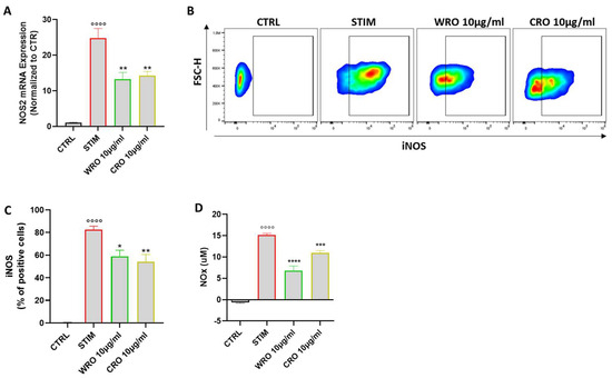 The J774A.1 cells were plated in a 24 multi-well and treated with WRO and CRO (10 μg/mL) for 1 h before the stimulation with LPS/IFN-γ for 24 h. The cells were incubated with a fixable viability dye (BioLegend, San Diego, CA, USA). Quantitative real-time PCR (RT-PCR) was performed using CFX384 real-time PCR for the live/dead gate and then fixed and permeabilized with Intracellular Fixation & Permeabilization Buffer (Thermo Fisher Scientific Waltham, MA, USA). After 30 min incubation, the cells were stained with anti-NOS2 (PE-Cy7) (Thermo Fisher Scientific Waltham, MA, USA) for 30 min at room temperature. For live vs. dead status, the J774 cells were treated with WRO and CRO for 24 h, then were labeled with the Zombie Green Fixable Viability Kit (BioLegend, San Diego, CA, USA), and washed as stated by the manufacturer’s instructions. The samples were acquired with a BriCyte E6 flow cytometer (Mindray, Medical Italy S.r.l, Milan, Italy) and analyzed with FlowJo software (Tree Star V.10; Carrboro, NC, USA).