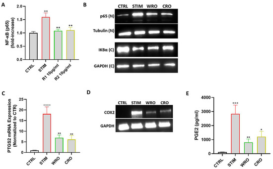 (A) Nuclear extracts were prepared using a nuclear extract kit. NF-κB-P65 activity was measured using an ELISA kit. (B) Representative images of p65 and IkB-α proteins detected via Western blot analysis, respectively, in cytosolic (C) and in nuclear (N) extract after 1 h of pre-treatment with 10 µg/mL of WRO and CRO and 30 min of LPS/IFN-γ stimulation. α-tubulin and GAPDH were used as an internal control. (C) mRNA levels of PTGS2 after treatment with WRO and CRO (10 μg/mL) for 1 h and stimulation with LPS (100 ng/mL) and INF-γ (20 ng/mL) for 6 h. (D) Representative images of COX-2 proteins detected via Western blot analysis in total extract. GAPDH was used as an internal control. (E) PGE2 concentrations in J774 cell culture supernatants after 24 h of treatment with the extracts (10 µg/mL) and stimulation with LPS/IFN-γ. Values were expressed as mean ± SEM from at least three independent experiments. °° p < 0.01, °°° p < 0.001, °°°° p < 0.0001 indicate a significant effect of LPS/INFγ compared with unstimulated cells (CTRL); * p < 0.05, ** p < 0.01, indicate a significant effect of CRO and WRO compared with LPS/INF-γ-stimulated cells.