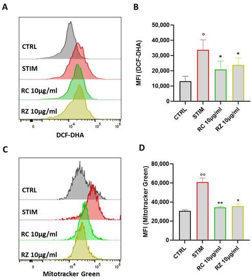 (A) Representative example of flow cytometry analysis of DCF-DHA probe. (B) DCF-DHA quantification in terms of mean fluorescence intensity (MFI). (C) Representative examples of flow cytometric analysis of MitoTracker Green (C) with its quantification in terms of mean fluorescence intensity (MFI) (D). Values were express as mean ± SEM from three independent experiments. ° p < 0.05, °° p < 0.01, indicate significant effect of LPS/INFγ-stimulated cells compared with unstimulated cells (CTRL); * p < 0.05, ** p < 0.01 indicated significant effect of WRO and CRO extracts compared with stimulated cells.