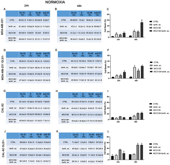 MC3138 and lanthanum acetate treatments increase cell death. (A,B) MDA-MB-231 cells were either left untreated or treated with lanthanum acetate, MC3138 or MC3138 + lanthanum acetate for 24 and 48 h. The percentage of cells in the different phases of the cell cycle was measured after propidium iodide staining and cytofluorimetric analysis. Percentages of sub-G1 cells are also reported and graphed in (C) showing an increase in the following treatments. (D,E) MDA-MB-231 cells silenced for GLS1 were either left untreated or treated with lanthanum acetate, MC3138 or MC3138 + lanthanum acetate for 24 and 48 h. The percentage of cells in the different phases of the cell cycle was measured after propidium iodide staining and cytofluorimetric analysis. Percentage of sub-G1 cells are also reported and graphed in (F) showing the increase following treatments. (G,H) CAL-62 cells were either left untreated or treated with lanthanum acetate, MC3138 or MC3138 + lanthanum acetate for 24 and 48 h. The percentage of cells in the different phases of the cell cycle was measured after propidium iodide staining and cytofluorimetric analysis. Percentage of sub-G1 cells are also reported and graphed in (I) showing an increase in following treatments. (J,K) CAL-62 cells silenced for GLS1 were either left untreated or treated with lanthanum acetate, MC3138 or MC3138 + lanthanum acetate for 24 and 48 h. The percentage of cells in the different phases of the cell cycle was measured after propidium iodide staining and cytofluorimetric analysis. Percentage of sub-G1 cells are also reported and graphed in (L) showing an increase following treatments. Experiments were repeated at least three times. Differences between pairs of groups were analyzed by Student’s t-test. * Significantly increased compared to control untreated cells. * p < 0.05. CTRL, control; lanth. ac., lanthanum acetate.