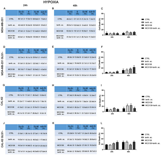 Hypoxia influences cell cycle and reduces cell death upon MC3138 and lanthanum acetate treatment. (A,B) MDA-MB-231 cells were either left untreated or treated with lanthanum acetate, MC3138 or MC3138 + lanthanum acetate under hypoxia for 24 and 48 h. The percentage of cells in the different phases of the cell cycle was measured after propidium iodide staining and cytofluorimetric analysis. Percentages of sub-G1 cells are also reported and graphed in (C) showing increases in the following treatments. (D,E) MDA-MB-231 cells silenced for GLS1 were either left untreated or treated with lanthanum acetate, MC3138 or MC3138 + lanthanum acetate under hypoxia for 24 and 48 h. The percentage of cells in the different phases of the cell cycle was measured after propidium iodide staining and cytofluorimetric analysis. Percentages of sub-G1 cells are also reported and graphed in (F) showing the increase in following treatments. (G,H) CAL-62 cells were either left untreated or treated with lanthanum acetate, MC3138 or MC3138 + lanthanum acetate under hypoxia for 24 and 48 h. The percentage of cells in the different phases of the cell cycle was measured after propidium iodide staining and cytofluorimetric analysis. Percentages of sub-G1 cells are also reported and graphed in (I) showing the increase in following treatments. (J,K) CAL-62 cells silenced for GLS1 were either left untreated or treated with lanthanum acetate, MC3138 or MC3138 + lanthanum acetate under hypoxia for 24 and 48 h. The percentage of cells in the different phases of the cell cycle was measured after propidium iodide staining and cytofluorimetric analysis. Percentages of sub-G1 cells are also reported and graphed in (L) showing the increase in following treatments. Experiments were repeated at least three times. CTRL, control; lanth. ac., lanthanum acetate.