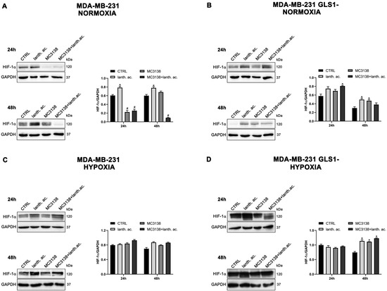 MC3138 reduces basal expression of HIF-1α in MDA-MB-231 cells. (A,B) MDA-MB-231 and MDA-MB-231 GLS1- cells were either left untreated or treated as indicated for 24 and 48 h under normoxic conditions. HIF-1α expression was determined by Western blot as described in Materials and Methods. (C,D) MDA-MB-231 and MDA-MB-231 GLS1- cells were either left untreated or treated as indicated for 24 and 48 h under hypoxic conditions. HIF-1α expression was determined by Western blot as described in Materials and Methods. GAPDH was used as loading control. HIF-1α expression was normalized with GAPDH and plotted as shown. * Significantly increased compared with untreated cells. *, p < 0.05. # Significantly decreased compared with control cells. #, p < 0.05. CTRL, control; lanth. ac., lanthanum acetate.