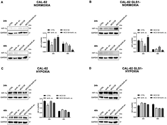 HIF-1α expression in CAL-62 cells. (A,B), CAL-62 and CAL-62 GLS1- cells were either left untreated or treated as indicated for 24 and 48 h under normoxic conditions. HIF-1α expression was determined by Western blot as described in Materials and Methods. (C,D), CAL-62 and CAL-62 GLS1- cells were either left untreated or treated as indicated for 24 and 48 h under hypoxic conditions. HIF-1α expression was determined by Western blot as described in Materials and Methods. GAPDH was used as loading control. HIF-1α expression was normalized with GAPDH and plotted as shown. * Significantly increased compared with untreated cells. *, p < 0.05. # Significantly decreased compared with control cells. #, p < 0.05. CTRL, control; lanth. ac., lanthanum acetate.