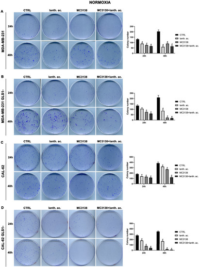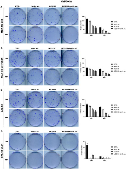 However, we noticed an increase in colony size post-hypoxia treatment. Also under hypoxia, treatments with lanthanum acetate, MC3138 and MC3138 plus lanthanum acetate reduced the number of colonies (Figure 6A,B). In the case of wt CAL-62, there was a decrease in the number of colonies and an increase in their size following 24 h of hypoxia compared to normoxia. The average number of 181 colonies in normoxia was reduced to 109 in hypoxia (Figure 5C vs. Figure 6C). Treatments with lanthanum acetate, MC3138 and MC3138 plus lanthanum acetate reduced the average number of colonies to 92, 64 and 45, respectively (Figure 6C). Such an effect was more evident in CAL-62 GLS1-, in which the average number of colonies dropped to 12 in the control, 0 with lanthanum acetate, 3 with MC3138 and 0 with MC3138 plus lanthanum acetate (Figure 6D). As expected, a greater reduction in the average number of colonies and increase in size was observed after 48 h of hypoxia in both cell lines and GLS1- clones. In MDA-MB-231 wt, the average number of colonies was 72 in the control, 40 with lanthanum acetate, 27 with MC3138 and 4 with MC3138 plus lanthanum acetate (Figure 6A). In MDA-MB-231 GLS1-, we counted an average of 80 colonies in the control, 52 after treatment with lanthanum acetate, 29 after MC3138 and 20 with MC3138 plus lanthanum acetate (Figure 6B). A hypoxic effect was clear also in CAL-62, in which we counted 87 colonies in the control, 63 with lanthanum acetate, 30 with MC3138, and 7 with MC3138 plus lanthanum acetate (Figure 6C). Finally, the strongest effect was observed in CAL-62 GLS1-, in which there was an average of three colonies in the control, one with lanthanum acetate and zero with both MC3138 and MC3138 plus lanthanum acetate (Figure 6D). These results on GLS1-silenced clones demonstrate once again the important role of GLS1 in cancer cells and the fact that this role becomes even more important under low oxygen tension.
