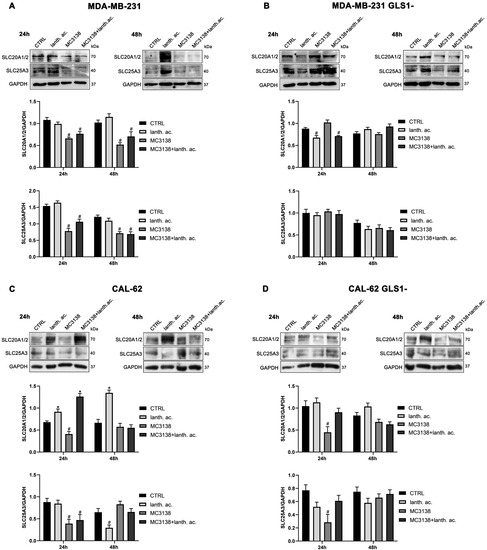 Since GAC requires Pi for its activity, we also determined the expression of phosphate transporters SLC20A1 and SLC20A2 localized in the plasma membrane and important for intracellular Pi homeostasis [35], as well as expression of the mitochondrial phosphate carrier SCL25A3, important for the transport of Pi in the mitochondrial matrix [36]. Our results show that SIRT5 activation through MC3138 decreased the expression of both SLC20A1, SLC20A2 and SLC25A3 in wt, but not in GLS1-silenced MDA-MB-231 cells (Figure 7A,B). In CAL-62 cells, a reduction was observed in both wt and GLS1-silenced cells (Figure 7C,D). Finally, prolonging MC3138 treatment to 48 h decreased SLC20A1, SLC20A2 and SLC25A3 expression only in wt MDA-MB-231 cells (Figure 7A).