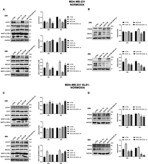 In hypoxia, MC3138 increased MAP1LC3B-II expression in MDA-MB-231 wt and GLS1- cells (Figure 10A,C). MC3138 decreased Beclin1 expression while increasing ULK1 Ser 757 phosphorylation in MDA-MB-231 cells (Figure 10A,C). Results were clearer with the mitophagy marker BNIP3. MC3138 still decreased BNIP3 expression in all the cell lines and clones studied (Figure 10B,D and Figure 11B,D). On the contrary, lanthanum acetate increased BNIP3 expression in MDA-MB-231 cells (Figure 10B,D). No relevant changes were observed for Parkin (Figure 10B,D and Figure 11B,D). The same trend for autophagy and mitophagy after lanthanum acetate and MC3138 treatment was maintained after 48 h. Again, major effects of MC3138 treatment were on mitophagy inhibition, as documented by BNIP3 decrease (Figure 10B,D and Figure 11B,D).