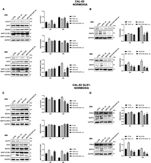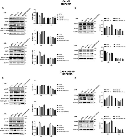 Modulation of autophagy and mitophagy markers in thyroid cancer cells treated with MC3138 and lanthanum acetate under hypoxia. (A) CAL-62 cells were treated under hypoxia as indicated in the figure. Expression levels of autophagy proteins ULK1, phosphorylated ULK1 (pULK1), BECN1 and MAP1LC3B were determined by Western blot. Densitometric analysis of the gels was performed as described in Materials and Methods and results graphed on the right side. (B) CAL-62 cells were treated under hypoxia as indicated in the figure. Expression levels of mitophagy proteins PRKN and BNIP3 were determined by Western blot. Densitometric analysis of the gels was performed as described in Materials and Methods and results graphed on the right side. (C) CAL-62 GLS1- cells were treated under hypoxia as indicated in the figure. Expression levels of autophagy proteins ULK1, phosphorylated ULK1 (pULK1), BECN1 and MAP1LC3B were determined by Western blot. Densitometric analysis of the gels was performed as described in Materials and Methods and results graphed on the right side. (D) CAL-62 GLS1- cells were treated under hypoxia as indicated in the figure. Expression levels of mitophagy proteins PRKN and BNIP3 were determined by Western blot. Densitometric analysis of the gels was performed as described in Materials and Methods and results graphed on the right side. Data are representative of three separate experiments with GAPDH used as a loading control. Differences between pairs of groups were analyzed by Student’s t-test. * Significantly increased compared with untreated cells. *, p < 0.05. # Significantly decreased compared with untreated cells. #, p < 0.05. CTRL, control; lanth. ac., lanthanum acetate.