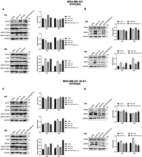 Modulation of autophagy and mitophagy markers in breast cancer cells treated with MC3138 and lanthanum acetate under hypoxia. (A) MDA-MB-231 cells were treated under hypoxia as indicated in the figure. Expression levels of autophagy proteins ULK1, phosphorylated ULK1 (pULK1), BECN1 and MAP1LC3B were determined by Western blot. Densitometric analysis of the gels was performed as described in Materials and Methods and results graphed on the right side. (B) MDA-MB-231 cells were treated under hypoxia as indicated in the figure. Expression levels of mitophagy proteins PRKN and BNIP3 were determined by Western blot. Densitometric analysis of the gels was performed as described in Materials and Methods and results graphed on the right side. (C) MDA-MB-231 GLS1- cells were treated under hypoxia as indicated in the figure. Expression levels of autophagy proteins ULK1, phosphorylated ULK1 (pULK1), BECN1 and MAP1LC3B were determined by Western blot. Densitometric analysis of the gels was performed as described in Materials and Methods and results graphed on the right side. (D) MDA-MB-231 GLS1- cells were treated under hypoxia as indicated in the figure. Expression levels of mitophagy proteins PRKN and BNIP3 were determined by Western blot. Densitometric analysis of the gels was performed as described in Materials and Methods and results graphed on the right side. Data are representative of three separate experiments with GAPDH used as a loading control. Differences between pairs of groups were analyzed by Student’s t-test. * Significantly increased compared with untreated cells. *, p < 0.05. # Significantly decreased compared with untreated cells. #, p < 0.05. CTRL, control; lanth. ac., lanthanum acetate.