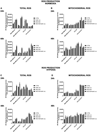 3.9. MC3138 and Lanthanum Acetate Increase Cytosolic and Mitochondrial ROS under Normoxia and Hypoxia