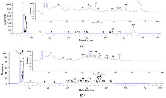 HPLC chromatograms of the flavonoids and polyphenols at 280 nm (a) and 320 nm (b) from blackthorn extract. Peaks’ identification: (a) 1—gallic acid; 2—chlorogenic acid; 3-(-)-epicatechin; 4—caffeic acid; 6—vanillic acid; 7—p-coumaric acid; 12—myricetin; 14—isorhamnetin; 5, 8–11, 13, 15–17—unidentified peaks; (b) 1—gallic acid; 2-(+)-catechin; 3—chlorogenic acid; 4—epicatechin; 5—caffeic acid; 17—myricetin; 23—isorhamnetin; 6–16, 18–22—unidentified peaks.