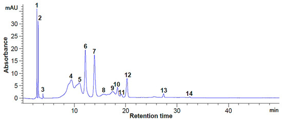 HPLC chromatogram of the anthocyanins from blackthorn extract at 520 nm. Peaks’ identification: 5—Delphinidin 3-O-β-D-glucoside; 7—Cyanidin 3-O-glucoside; 8—Cyanidin 3-O-rutinoside; 10—Peonidin 3-O-glucoside; 1–4, 6, 9, 11–14—unidentified peaks.