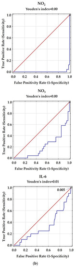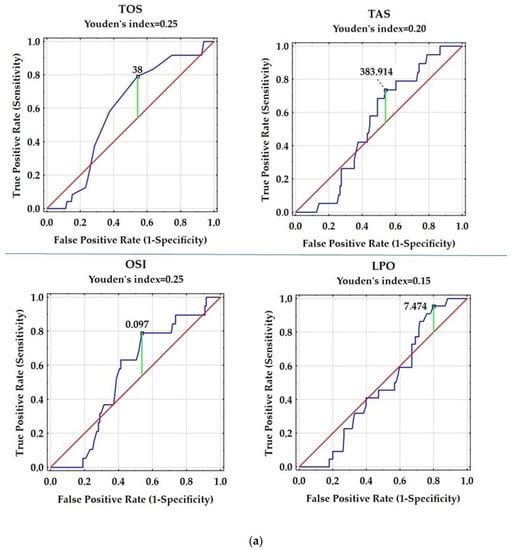 The ROC curve for all investigated parameters was plotted in the diagnosis of RRMS as shown Figure 1a–c and Table 2. GPx with AUC = 0.831 (x = 0.3387; y = 0.92) has the highest values as single parameter form whole analyzed parameters for distinguishing patients with RRMS from control group. While OSI with AUC = 0.533 (x = 0.5378; y = 0.7639); CAT with AUC = 0.312 (x = 0.9572; y = 1.013) and IL-6 with AUC = 0.351 (x = 0.9933; y = 1) is not sufficient to distinguish patients with RRMS from the control group. Furthermore, we did not confirm the usefulness of determining the concentrations of TOS, NO2, NO3, LPO, TAS, nor the activity of SOD and the value of the SOD/GPx + CAT ratio to differentiate RRMS from controls. We were not able to determine the value to discriminate patients with RRMS and the control group for the concentration of NO2, NO3, or the value of the SOD/GPx + CAT ratio (Figure 1b,c).