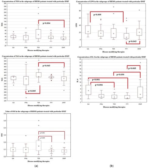 All investigated variables were compared among the subgroups of patients treated with DMT. There were statistically significant differences between these subgroups in the disease duration and EDSS score. Differences were also observed in the concentration of IL-6, TOS, LPO, TAS, as well as in the activity of CAT, while the activity of SOD and GPx as well as the value of SOD/GPx + CAT was similar across the subgroups (Table 5).