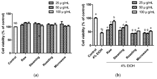 Cytotoxicity of various concentration of purple sweet potato (a) and cytoprotective effect (b) of various concentration of samples (25, 50, and 100 µg/mL) against 4% ethanol-induced cytotoxicity. The vertical bars represent mean values ± SD and values marked by same letter are not significantly different (p < 0.05). NS, not significant.