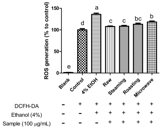 To prepare the extracts, lyophilized samples (10 g) were mixed with 500 mL of methanol for 18 h using a shaker at 23 °C. The solutions were passed through Whatman No. 2 filter paper (Whatman International, Kent, UK), and the methanol was removed using a vacuum evaporator (Eyela, Tokyo, Japan) at 38 °C. Each residue was dissolved in dimethyl sulfoxide (DMSO) at a concentration of 100 mg/mL and stored at −80 °C until use. The extraction yield was 13.55% (w/w) for raw sample, 11.79% for the steamed, 17.20% for the microwaved, and 17.48% for roasted. Samples were diluted with serum-free medium containing 4% ethanol before treatment to cells. The final concentration of DMSO was less than 0.1% (v/v) in all treatment groups.
