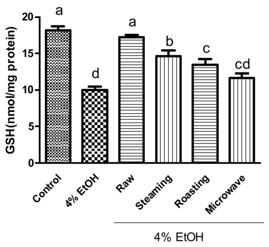 Effects of purple sweet potato with different cooking methods on ethanol-induced GSH depletion in HepG2 cells. The vertical bars represent mean values ± SD and values marked by same letter are not significantly different (p < 0.05).
