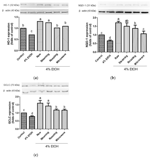 Effects of purple sweet potato with different cooking methods on the protein expression of HO-1 (a), NQO1 (b), and GCLC (c) in ethanol-induced HepG2 cells. β-actin served as internal control. All data are representative of three independent experiments. The vertical bars represent as mean values ± SD and values marked by same letter are not significantly different (p < 0.05).