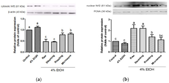 Nrf2 is an important transcription factor, which modulates the gene expression of antioxidant enzymes, such as NQO1, HO-1, and GCLC. In this study, the activation of Nrf2 by purple sweet potato in response to alcoholic oxidative damage was evaluated in HepG2 cells. Raw and steamed purple sweet potatoes showed significantly decreased Nrf2 protein expression in the cytoplasm (Figure 5a). In contrast, these samples showed dramatically enhanced nuclear Nrf2 protein expression compared to the roasted or microwaved samples (Figure 5b). Nrf2 translocates from the cytosol to the nucleus by dissociating from Kelch-like ECH-associated protein 1 upon oxidative attack [46]. Several antioxidants induce HO-1 expression via Nrf2 activation in ethanol-damaged hepatocytes [23,47]. In addition, it has been demonstrated that Nrf2 is activated by cyanidin-3-glycoside against oxidative stress and activates the extracellular-regulated kinases/Nrf2 antioxidant signaling [48]. Xu et al. reported that the knockout of Nrf2 could lose the cytoprotective effects of gentiopicroside, a potent antioxidant, on the Nrf2 pathway against oxidative damage in HepG2 cells [49]. Our results show that steamed purple sweet potato markedly induced the upregulation of phase II enzymes and Nrf2 activation in response to alcohol stress, similar to the raw sample. Moreover, these results are consistent with the finding that Nrf2 suppresses oxidative damage by regulating the activity of antioxidant enzymes during stress [49]. Therefore, the activation of the Nrf2 pathway could be proposed as a therapeutic approach to reduce oxidative stress through alcohol consumption.