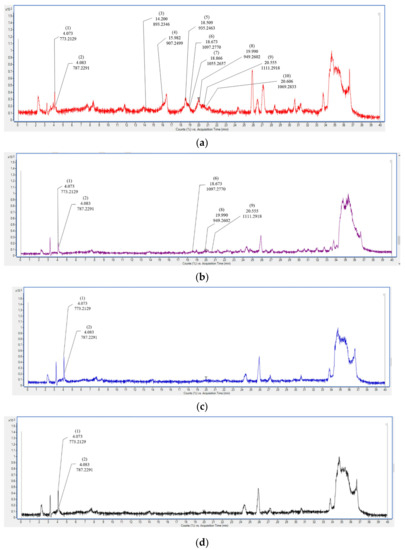 Total ion chromatogram (TIC) of anthocyanins in raw (a), steamed (b), roasted (c), and microwaved (d) purple sweet potato by different cooking methods using LC-QTOF/MS analysis. Cyanidin-3-sophoroside-5-glucoside (1), peonidin-3-sophoroside-5-glucoside (2), cyanidin 3-p-hydroxybenzoyl sophoroside-5-glucoside (3), peonidin 3-p-hydroxybenzoyl sophoroside-5-glucoside (4), cyanidin 3-(6′′′-caffeoyl sophoroside)-5-glucoside (5), cyanidin 3-dicaffeoyl sophoroside-5-glucoside (6), cyanidin 3-dicaffeoyl sophoroside-p-hydroxybenzoyl sophoroside-5-glucoside (7), peonidin 3-(6′′′-caffeoyl sophoroside)-5-glucoside (8), peonidin 3-dicaffeoyl sophoroside-5-glucoside (9), peonidin 3-caffeoyl sophoroside-p-hydroxybenzoyl sophoroside-5-glucoside (10).