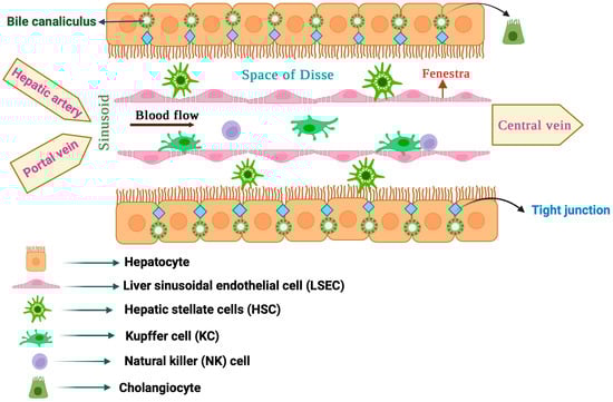The liver is a large organ constituting about 2% of body weight in adult humans []. It is anatomically divided into a larger right and a smaller left lobe, each made up of thousands of lobules. The liver lobules contain parenchymal and non-parenchymal cells that interact to form a functional hepatic unit (Figure 1) []. Parenchymal cells include hepatocytes, the predominant liver cell population, and cholangiocytes. Non-parenchymal cells include sinusoidal endothelial cells, macrophages, stellate cells and natural killer cells [,].