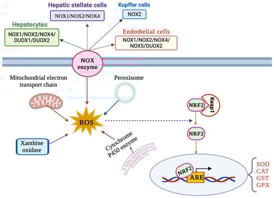 NOX enzymes are major sources of ROS production in the liver []. Moreover, it appears that NOX-derived ROS are important contributors to the onset and progression of liver injury and chronic liver disease []. Thus, the activation of NOX1, NOX2 and NOX4 isoforms in liver cells is associated with HSCs activation, apoptosis/necrosis of hepatocytes and the amplification of inflammatory responses through KCs activation [,,].