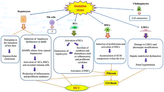While ROS and lipid peroxidation products impair hepatocellular function and viability, they promote the differentiation and activation of HSCs to myofibroblasts, leading to the secretion and accumulation of collagen and other ECM components within the liver []. Therefore, chronic activation of HSCs in response to oxidative stress favors the development of liver fibrosis, which may progress to cirrhosis and HCC [,].