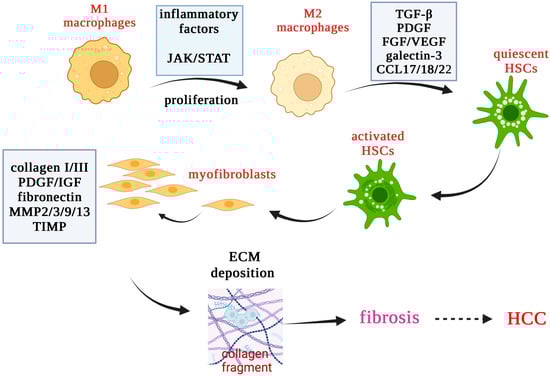 Macrophages modulate liver fibrosis by providing an inflammatory milieu that favors extensive production of pro-inflammatory cytokines and chemokines, which in turn activate HSCs [,]. M1 macrophages may convert to the anti-inflammatory M2 subtype, critical for the progression of liver fibrosis. Thus, M2 macrophages produce pro-fibrogenic factors such as TGF-β, vascular endothelial growth factor (VEGF) and galectin-3, which promote myofibroblast proliferation and activation leading to ECM deposition. Sustained fibrosis can cause the production of growth factors, proteolytic enzymes, pro-fibrogenic cytokines and collagen fragments [,].