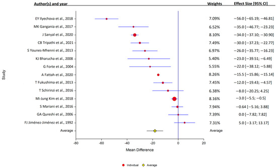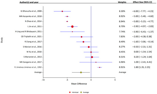 Of the 14 studies that assessed serum copper levels, 11 found that the levels were lower in PD, while 3 found that they were similar in the PD and control samples. Overall, serum copper levels were lower in PD patients (14 studies: PD, 1377 samples; control, 1283 samples); study heterogeneity was high (I2 = 98.3%; Q, 419; p < 0.001) (Figure 3).