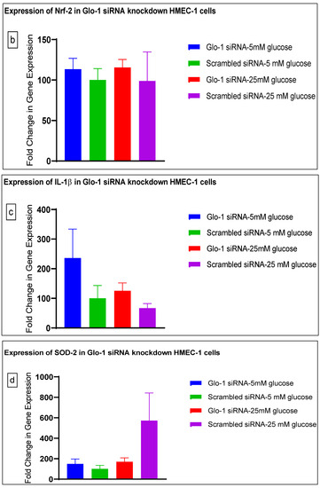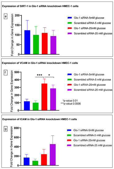 Here, we have shown that the siRNA-mediated downregulation of Glo-1 leads to an upregulation in the expression of VCAM under hyperglycemic conditions (p-value = 0.003). However, no change was observed in the expression of SIRT-1, ICAM, antioxidant gene SOD-2 and its transcription factor Nrf-2, or the NLRP-3 inflammasome and its associated proteins Caspase-1 and TXNIP.