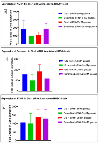 Gene expression of Glyoxalase-1 gene was determined using real time quantitative PCR as a means to confirm successful siRNA mediated downregulation of Glo-1 versus control/scrambled siRNA (Figure 3a–j); which was significantly reduced in the Glo-1-siRNA-transfected cells compared to the control siRNA (p-value < 0.001) (Figure 3a). In addition, a significant upregulation in the expression of VCAM (p-value < 0.001) was seen in the experimental group experiencing Glo-1 siRNA knockdown followed by the high-glucose treatment, compared to the control/scrambled siRNA-treated cells (Figure 3f). Similarly, a significant difference was also observed in the expression of VCAM between the Glo-1 siRNA followed by 25 mM glucose vs. the scrambled (Control) siRNA followed by 25 mM glucose treatment groups (p-value = 0.01). All qPCR reactions were performed after 48 h of transfection with Glo-1 siRNA. The experiment was performed at least thrice, in triplicate; data are represented as the mean ± SEM (N = 4; n = 9) and were statistically analyzed using one-way ANOVA followed by Dunnett’s post hoc test for multiple comparisons between experimental groups; a p-value < 0.05 was considered significant.