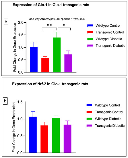 A significant difference was observed between the expressions of the Glo-1 wildtype diabetic and transgenic control groups (p-value = 0.006) and between those of the wildtype diabetic and transgenic diabetic rats (p-value = 0.047) (Figure 4a).