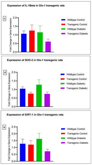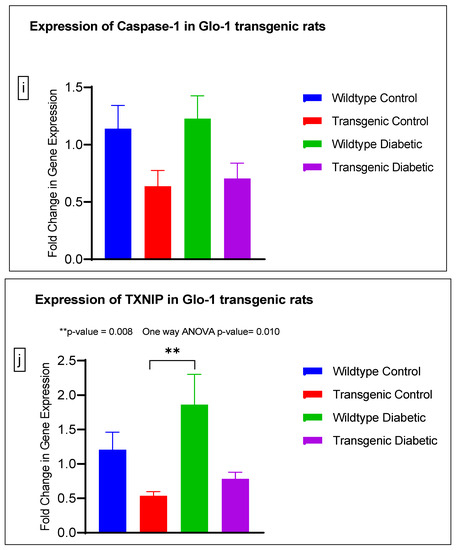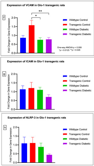 The gene expression of various markers of endothelial dysfunction was determined using real-time quantitative PCR in transgenic Glo-1 rats divided into four experimental groups: wildtype control/healthy rats, wildtype diabetic rats, transgenic control rats and transgenic diabetic rats (n = 7 ± 2) (Figure 4a–j). A one-way ANOVA with Tukey’s post hoc analysis for multiple comparison analysis across various experimental groups was used to determine the statistical difference between the target gene expressions of the experimental groups.