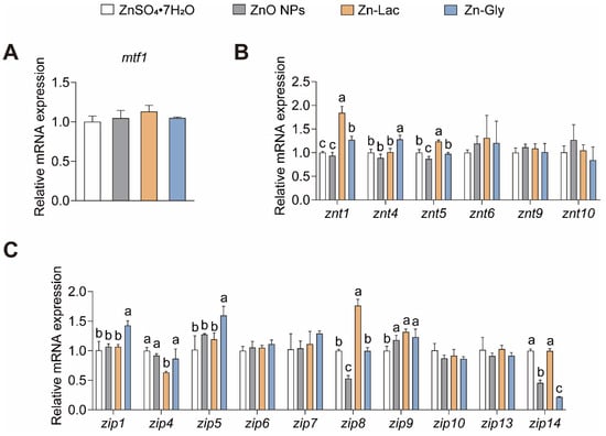 Different dietary Zn sources affected intestinal Zn transport-related genes expression in juvenile grass carp. (A) The mtf1 mRNA levels. MTF1, metal response element binding transcription factor 1; (B) The mRNA levels of ZnT family proteins; (C) The mRNA levels of ZIP family proteins. Values are shown as mean ± S.D. (n = 3 replicate tanks). Values with different letters (a–c) within the same row are significantly different at p < 0.05.