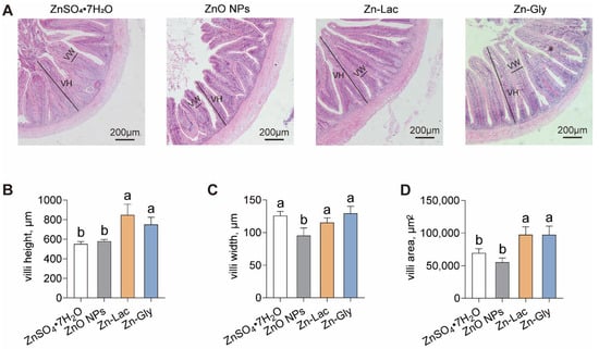The intestinal morphology of grass carp was analyzed after feeding diets containing different Zn sources (Figure 2A). Unlike the other three dietary groups, the ZnO NPs diet damaged the histological structures of villi in grass carp (Figure 2A). The villi height and area were higher for grass carp fed two organic Zn sources (Zn-Lac and Zn-Gly) compared to those fed diets containing ZnO NPs and ZnSO4·7H2O (by 29.28–53.92% and 40.23–76.41%, respectively, p = 0.002 and 0.002, respectively) (Figure 2A–C). The villi width was lower for grass carp fed the ZnO NPs diet than those in the other three groups (by 17.25–26.40%, p = 0.008) (Figure 2A–C). These results demonstrate that two organic Zn sources contribute to better intestinal histology for the grass carp.
