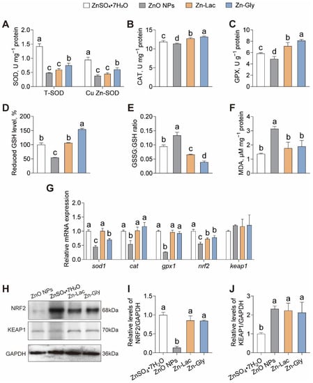 Different dietary Zn sources affected the intestinal antioxidant capacity of grass carp. (A) superoxide dismutase (SOD) activity. (B) catalase (CAT) activity. (C) glutathione peroxidase (GPX) activity. (D) reduced glutathione level. (E) oxidized/reduced glutathione ratio. (F) malondialdehyde. (MDA) content. (G) mRNA levels of oxidative stress-related genes. (H–J) Western blot and statistical analysis of NRF2 and KEAP1 expression. Values are shown as mean ± S.D. (n = 3 replicate tanks). Values with different letters (a–d) within the same sub-figure are significantly different at p < 0.05.