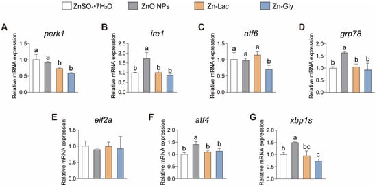 Different dietary Zn sources affected the endoplasmic reticulum stress-related genes expression in the intestinal of grass carp. (A) perk. (B) ire1. (C) atf6. (D) grp78. (E) eif2a. (F) atf4. (G) xbp1s. ATF4, activating transcription factor 4; ATF6, activating transcription factor 6; EIF2a, eukaryotic translation initiation factor 2α; GRP78, glucose-regulated protein 78; IRE1, inositol-requiring enzyme 1; PERK, Eukaryotic translation initiation factor 2-alpha kinase 3; XBP1, X-box binding protein 1. Values are shown as means ± S.D. (n = 3 replicate tanks). Values with different letters (a–c) within the same gene are significantly different at p < 0.05.