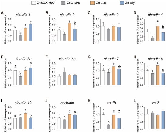 Different dietary Zn sources affected the mRNA abundance of tight junction-related genes in the intestinal of grass carp. (A) claudin 1. (B) claudin 2. (C) claudin 3. (D) claudin 4. (E) claudin 5a. (F) claudin 5b. (G) claudin 7. (H) claudin 8. (I) claudin 12. (J) occluding. (K) zo-1b. (L) zo-2. Values are shown as mean ± S.D. (n = 3 replicate tanks). Values with different letters (a–c) within the same gene are significantly different at p < 0.05.