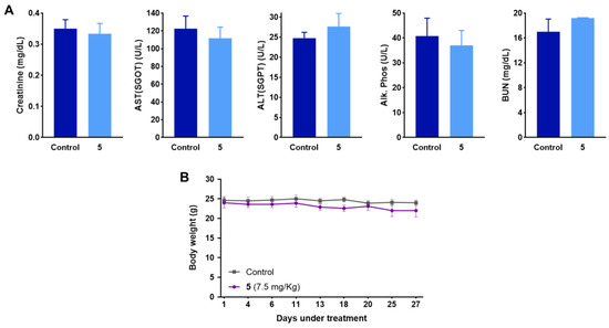 Mice were treated either with intraperitoneal doses of 7.5 mg/Kg of compound 5 or with DMSO (vehicle) thrice weekly and kept under observation for 27 days. Body weight, behavior, and food and water intake were monitored every alternate day. At the end of the study, animals were sacrificed by euthanizing the animals by CO2 asphyxiation. The blood serum was withdrawn and subjected to the biochemical analysis of creatinine (mg/dL), AST(SGOT) (U/L), ALT(SGPT) (U/L), Alk. Phos (U/L), and BUN (mg/dL).