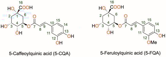 Molecular structure of the investigated phenolic acid derivatives (5-CQA = 5-caffeoylquinic acid and 5-FQA = 5-feruloylquinic acid).