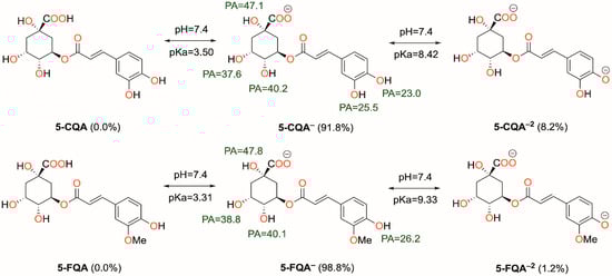 Acid-base equilibrium of 5-CQA and 5-FQA at physiological pH (7.4). PA = proton affinity.