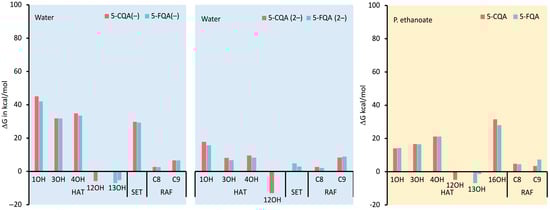 On the other hand, the aromatic OH groups had negative ΔG values for both 5-CQA and 5-FQA (−5.8 to −13.0 kcal/mol), suggesting that they are the most likely sites for the HAT process. In terms of the SET mechanism, both forms showed positive ΔG values. However, the dianionic form exhibited the lowest ΔG values (2.0–4.8 kcal/mol vs. 29.3–29.8 kcal/mol), indicating that this mechanism could also be possible for this form.