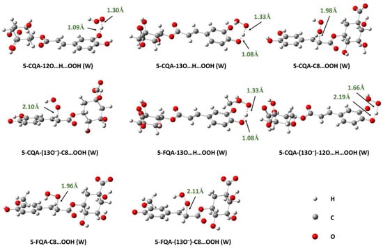 Using the QM-ORSA protocol [], and based on the thermodynamic evaluation, we calculated the overall and individual rate constants for the reaction between 5-CQA and 5-FQA with the HOO• radical in water at physiological pH. The results are presented in Table 1, and the localized transition states can be seen in Figure 4. We found that both 5-CQA and 5-FQA reacted with high-rate constants of 2.68 × 108 M−1s−1 and 2.28 × 107 M−1s−1, respectively. However, the reaction of 5-CQA is about 10 times faster than that of 5-FQA. Analysis of the data in Table 1 reveals that the SET mechanism is exclusive in the case of 5-FQA (Γ = 100%), while the HAT mechanism at 12OH plays a dominant role in the case of 5-CQA (Γ = 70%), despite the high-rate constant of the electron transfer process (7.95 × 107 M−1s−1). This suggests that the deprotonated catechol moiety in water is highly reactive toward radical species. Similar findings were also observed for other catechol derivatives, such as 5-O-methylnorbergenin [], quercetins [], caftaric acid [], and anthocyanidins [].