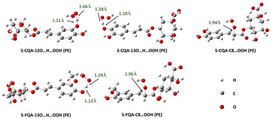Optimized TSs structures of the reaction of 5-CQA and 5-FQA with HOO• radical following HAT (hydrogen atom transfer) and RAF (radical adduct formation) mechanisms in pentyl ethanoate (PE).