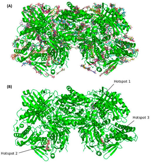 (A) Blinding the docking complex with all hotspots from the BD consensus. In (B), only the best three hotspots are represented. Illustrative images were prepared using the Pymol software version 2.5.0.