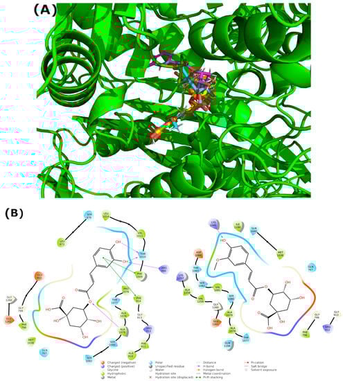 (A) Blinding the docking complex with hotspot number 1 resulted from the BD consensus. Illustrative images were prepared using the Pymol software version 2.5.0. (B) Two-dimensional protein‒ligand interaction diagram generated between xanthine oxidase and 5-CQA (left) and 5-FQA (right), using the Ligand Interaction script in Maestro (Schrödinger, Inc., www.schrodinger.com accessed on 20 June 2022).