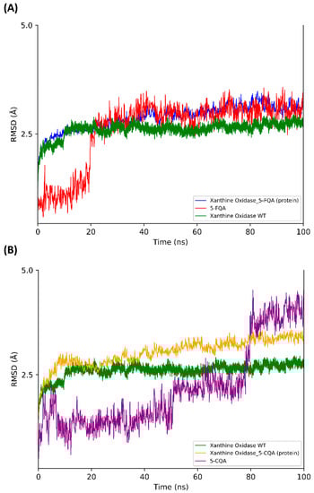 The root-mean-square deviation (RMSD) obtained for xanthine oxidase (blue (A) and orange (B)) bound to 5-FQA (red) or 5-CQA (purple) plotted with respect to the initial pose. The RMSD of the xanthine oxidase WT is represented in both plots (A,B) in green.
