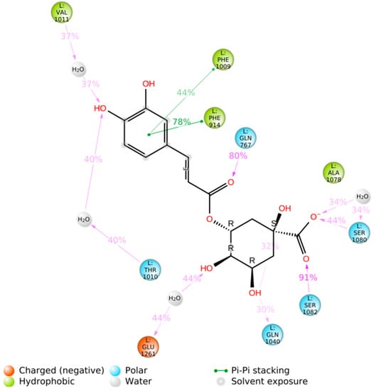 Two-dimensional protein‒ligand interaction diagram generated between xanthine oxidase and 5-CQA, using the Simulation Interactions Diagram script in Maestro (Schrödinger Inc., www.schrodinger.com accessed on 20 June 2022).