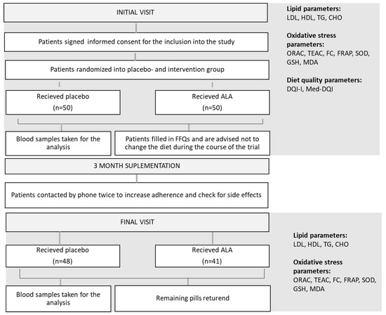 Flowchart of trial activities. ALA—alpha lipoic acid; LDL—low density lipoproteins; HDL—high density lipoproteins; TG—triglycerides; CHO—total cholesterol; ORAC—oxygen radical absorbance capacity; TEAC—Trolox equivalent antioxidant activity; FC—Folin–Ciocalteu reducing capacity; FRAP—ferric reducing activity; SOD—superoxide dismutase activity; GSH—reduced glutathione; MDA—malondialdehyde; DQI-I—Diet Quality Index-International; Med-DQI—Mediterranean Diet Quality Index; FFQ—Food Frequency Questionnaire.